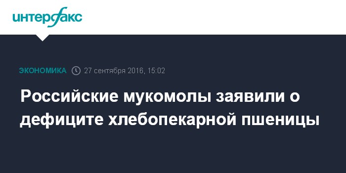 Москва. 27 сентября. INTERFAX.RU - Представители мукомольной отрасли РФ серьезно обеспокоены низким качеством зерна в этом году. Дефицит продовольственной пшеницы 3-го класса, необходимой для получения хлебопекарной муки, они оценивают в 12,6 млн тонн.
