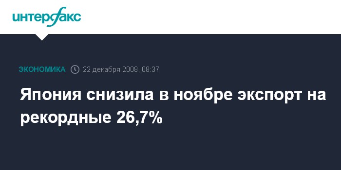 Москва. 22 декабря. INTERFAX.RU - Япония в результате падения мирового спроса на автомашины, электронику и другие товары снизила в ноябре объем экспорта на 26,7% по сравнению с аналогичным периодом прошлого года, что является абсолютным рекордом, сообщает Bloomberg со ссылкой на данные официальной статистики.