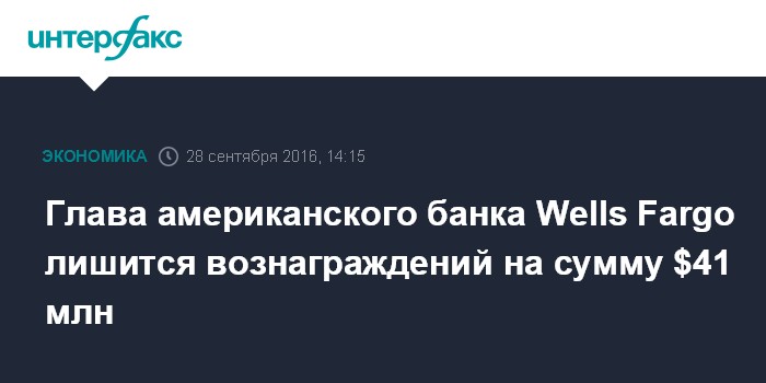 Москва. 28 сентября. INTERFAX.RU - Председатель совета директоров и главный исполнительный директор американского банка Wells Fargo Джон Стампф лишится всех негарантированных вознаграждений, полученных им в форме акций - в общей сложности на сумму $41 млн - в результате выявления незаконных манипуляций в банке с целью завышения показателей продаж банковских продуктов и услуг. Как говорится в пресс-релизе Wells Fargo, Стампф не будет получать зарплату в период проведения внутреннего расследования в банке. Он также не получит бонус за 2016 год.