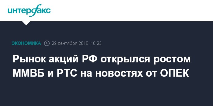 Москва. 29 сентября. INTERFAX.RU - Рынок акций РФ открылся в четверг ростом цен blue chips вслед за подъемом мировых площадок и раллировавшей нефтью на новостях о договоренностях ОПЕК в Алжире о сокращении добычи сырья; индексы ММВБ и РТС за минуту торгов прибавили 1,1-2,6%, превысив рубежи 2000 и 1000 пунктов соответственно.