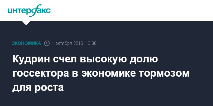 Москва. 1 октября. INTERFAX.RU - Высокая доля государственного сектора в экономике РФ является одним из основных тормозов экономического роста, по этому показателю Россия уже опережает Китай, в котором доля госсектора опустилась ниже 50%, заявил зампред Экономического совета при президенте РФ Алексей Кудрин, выступая на сессии "Развилки экономического роста" на форуме "Сочи-2016".