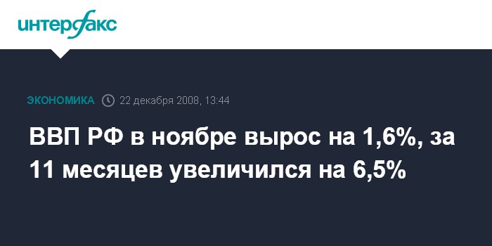 В целом за 11 месяцев 2008 г. ВВП РФ вырос на 6,5%. За январь-ноябрь 2007 г. ВВП России увеличился на 7,9%, в том числе в ноябре 2007 года - на 9,0%.