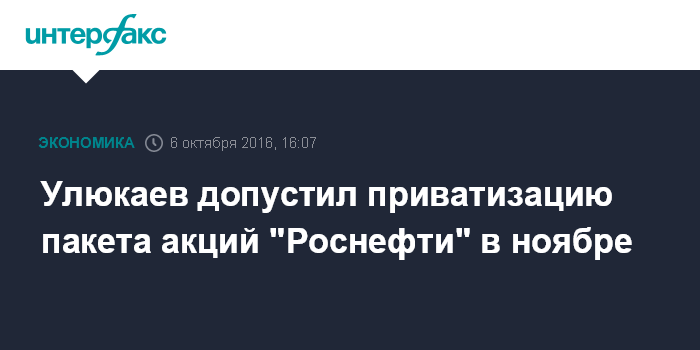 Москва. 6 октября. INTERFAX.RU - Сделка по приватизации 19,5% "Роснефти" возможна в ноябре, считает глава Минэкономразвития Алексей Улюкаев. "По графику, скорее всего, ноябрь", - сказал министр журналистам, комментируя вопрос о возможных сроках продажи пакета акций "Роснефти".