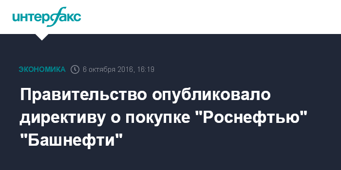 Москва. 6 октября. INTERFAX.RU - Директива госпредставителям в совете директоров "Роснефть" относительно голосования по вопросу о покупке контрольного пакета "Башнефти" опубликована на официальном сайте правительства.