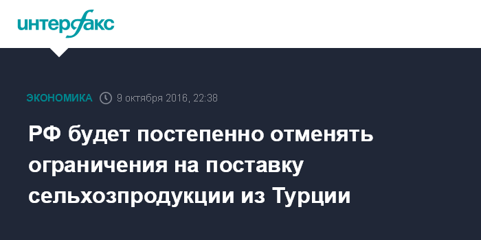 Москва. 9 октября. INTERFAX.RU - Россия будет постепенно отменять ограничения на ввоз сельхозпродукции из Турции, часть плодоовощной продукции может вернуться на российский рынок до конца года, сказал журналистам глава Минэкономразвития Алексей Улюкаев по итогам встречи с министром экономики Турции Нихатом Зейкбекчи в воскресенье в Стамбуле.