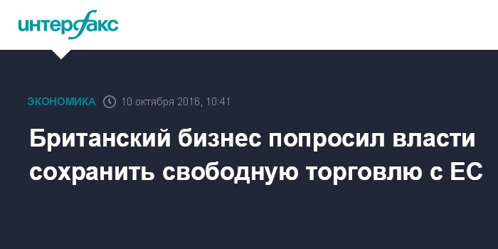 Москва. 10 октября. INTERFAX.RU - Организации, представляющие интересы крупного британского бизнеса, подписали совместное заявление с адресованным правительству страны призывом сохранить свободную торговлю с ЕС при процедуре выхода из союза, сообщает BBC. Под обращением стоят подписи Конфедерации британской промышленности (CBI), группы TechUK (представляет интересы IT-компаний) и еще нескольких подобных групп.