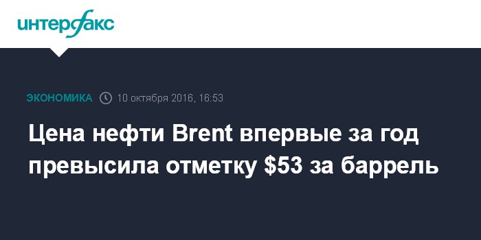Москва. 10 октября. INTERFAX.RU - Котировки нефти марки Brent в ходе торгов в понедельник превысили отметку в $53 за баррель, впервые с первой половины октября 2015 года.