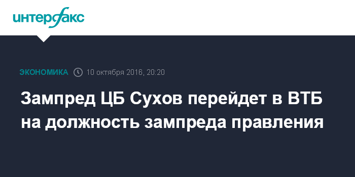 Москва. 10 октября. INTERFAX.RU - Зампред ЦБ РФ Михаил Сухов, покидающий пост 17 октября, перейдет на работу в ВТБ, сообщил "Интерфаксу" источник, близкий к ЦБ. По его словам, Сухов займет должность зампреда правления ВТБ.