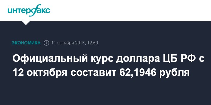 Официальный курс доллара ЦБ РФ с 12 октября составит 62,1946 рубля