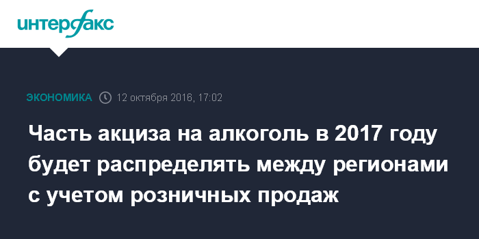Москва. 12 октября. INTERFAX.RU - Новый порядок распределения части акциза на крепкий алкоголь, зачисляемого в региональные бюджеты, между субъектами РФ заработает с 2017 года.