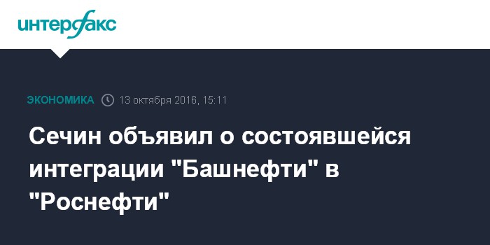 Москва. 13 октября. INTERFAX.RU - Интеграция "Башнефти" в состав "Роснефти" уже произошла, заявил глава "Роснефти" Игорь Сечин.