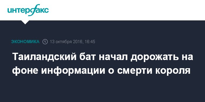 Москва. 13 октября. INTERFAX.RU - Стоимость таиландского бата относительно доллара США растет в четверг после публикации информации о кончине короля Таиланда. Король Пхумипон Адульядет скончался в больнице в возрасте 88 лет, говорится в заявлении королевского дворца.