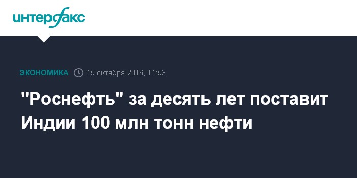 Москва. 15 октября. INTERFAX.RU - "Роснефть" планирует поставить в Индию 100 млн тонн нефти в течение десяти лет, заявил президент России Владимир Путин.
