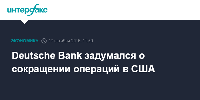 Москва. 17 октября. INTERFAX.RU - Deutsche Bank AG рассматривает возможность сокращения объема своих операций в США, сообщает агентство Bloomberg со ссылкой на осведомленные источники. По словам источников, такая возможность обсуждается руководством Deutsche Bank в рамках общего пересмотра стратегии, при котором отдельные направления бизнеса банка рассматриваются в контексте регулятивных ограничений и требований к капиталу.