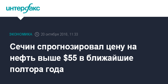 Сечин спрогнозировал цену на нефть выше $55 в ближайшие полтора года