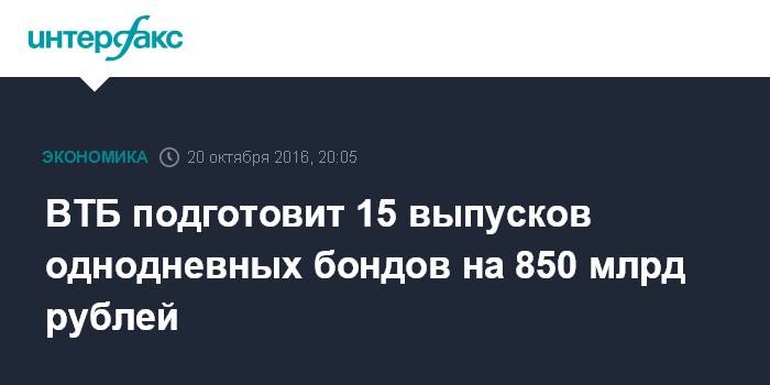 ВТБ подготовит 15 выпусков однодневных бондов на 850 млрд рублей