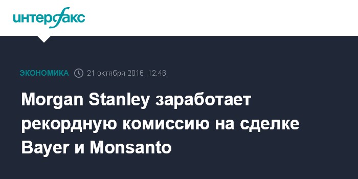 Москва. 21 октября. INTERFAX.RU - Комиссия банка Morgan Stanley за организацию слияния германской химкомпании Bayer AG и ее американского конкурента Monsanto стоимостью $66 млрд составит около $120 млн и, как ожидается, может стать рекордной для этого сегмента, пишет Financial Times.
