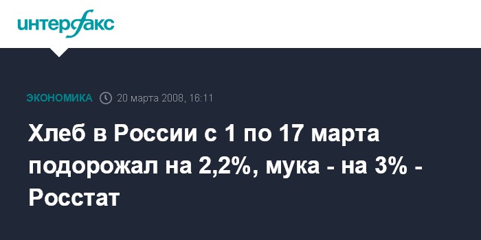 Москва. 20 марта. INTERFAX.RU - Потребительские цены на хлеб из пшеничной муки в РФ за неделю с 12 по 17 марта выросли на 0,9%, а с начала месяца - на 2,2%, сообщил "Интерфаксу" источник в одном из ведомств финансово-экономического блока со ссылкой на данные Росстата.