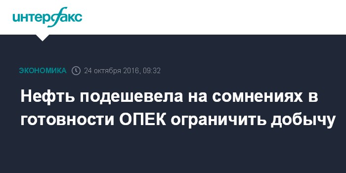 Как сообщалось, в конце сентября страны ОПЕК предварительно договорились сократить добычу нефти до уровня 32,5-33 млн баррелей в сутки. Ожидается, что условия соглашения будут согласованы на ноябрьской встрече картеля, и к соглашению может присоединиться Россия, крупнейший производитель нефти в мире.
