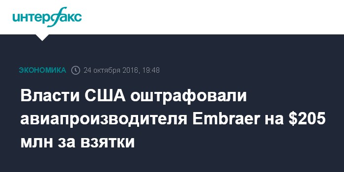 Москва. 24 октября. INTERFAX.RU - Комиссия по ценным бумагам и биржам (SEC) и министерство юстиции США оштрафовали бразильского производителя самолетов Embraer SA в общей сложности на $205 млн по делу о даче взяток в обмен на получение правительственных контрактов, говорится в сообщении SEC.