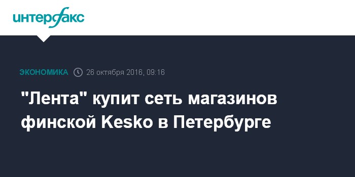 Москва. 26 октября. INTERFAX.RU - Финская группа Kesko продает свою продуктовую сеть в России, состоящую из 11 магазинов "К-Руока" в Петербурге и окрестностях, а также три земельных участка, розничной сети "Лента" за 11 млрд рублей.