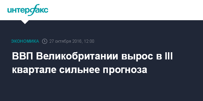 Москва. 27 октября. INTERFAX.RU - ВВП Великобритании в третьем квартале 2016 года вырос на 0,5% по сравнению с предыдущими тремя месяцами, свидетельствуют предварительные данные Национального статистического управления (ONS). Рост британской экономики замедлился по сравнению со II кварталом, когда он составлял 0,7%, но превзошел консенсус-прогноз экономистов на уровне 0,3%. Подъем ВВП относительно июля-сентября 2015 года составил 2,3% при ожидавшемся повышении на 2,1%, которое совпадало бы с темпами роста в годовом выражении во II квартале.