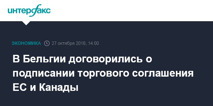 Москва. 27 октября. INTERFAX.RU - Межбельгийские переговоры в рамках комитета согласия о подписании Бельгией соглашения о свободной торговле между ЕС и Канадой завершились в четверг договоренностью сторон, объявили в Брюсселе правительственные источники.