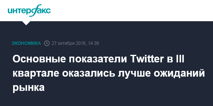 Москва. 27 октября. INTERFAX.RU - Американская компания Twitter, которой принадлежит одноименный сервис микроблогов, в третьем квартале продемонстрировала лучшие, чем ожидалось, показатели скорректированной прибыли, выручки и роста ежемесячно активных пользователей. Как сообщается в пресс-релизе компании, скорректированная прибыль в минувшем квартале составила 13 центов на акцию против 10 центов годом ранее.