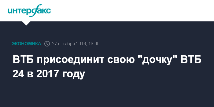 Москва. 27 октября. INTERFAX.RU - ВТБ планирует в 2017 году присоединить розничную "дочку" - банк ВТБ 24, сообщил руководитель службы по работе с акционерами ВТБ Владимир Хоткин журналистам в четверг.