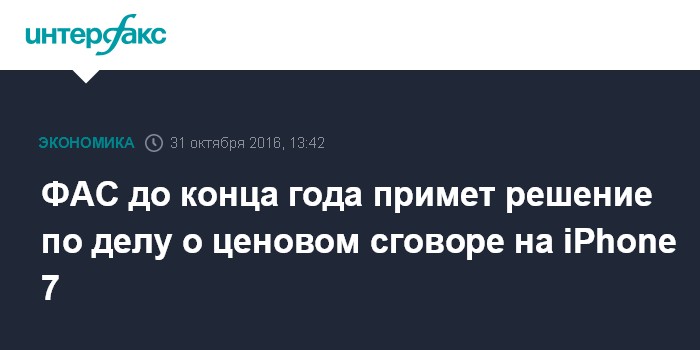 Москва. 31 октября. INTERFAX.RU - Федеральная антимонопольная служба РФ до Нового года примет решение, возбуждать ли очередное дело по ценовому сговору на iPhone седьмой модели/ Об этом заявил начальник управление по борьбе с картелями ФАС Андрей Тенишев.