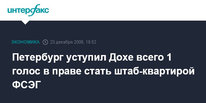 Москва. 23 декабря. INTERFAX.RU - Санкт-Петербург уступил Дохе в праве стать штаб-квартирой Форума стран-экспортеров газа (ФСЭГ) всего один голос, сообщил журналистам представитель "Газпрома".