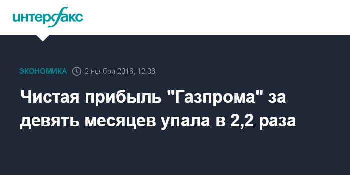 Москва. 2 ноября. INTERFAX.RU - Чистая прибыль головной компании ПАО "Газпром" по российским стандартам РСБУ за 9 месяцев 2016 года упала в 2,2 раза - до 75,4 млрд рублей с 169,754 млрд рублей за январь-сентябрь 2015 года, свидетельствуют расчеты "Интерфакса" на основе данных компании.