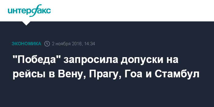 Москва. 2 ноября. INTERFAX.RU - "Победа" запросила у Росавиации допуски на регулярные рейсы из Москвы в Вену, Прагу, Стамбул, а также из Астрахани и Екатеринбурга в Гоа, сообщил "Интерфаксу" официальный представитель авиакомпании в среду.