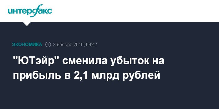 Москва. 3 ноября. INTERFAX.RU - Авиакомпания "ЮТэйр" в январе-сентябре 2016 года получила 2,11 млрд рублей чистой прибыли про РСБУ против 2,482 млрд рублей чистого убытка за аналогичный период 2015 года, говорится в отчетности перевозчика. Валовая прибыль выросла в 1,8 раза - до 3,453 млрд рублей. При этом выручка увеличилась на 12,7% - до 43,494 млрд рублей.