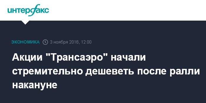 Москва. 3 ноября. INTERFAX.RU - Акции "Трансаэро" днем в четверг теряют порядка 20% в рамках коррекции после взлета накануне на 70% на корпоративных новостях о планах "перезапуска" авиакомпании, которую спекулянты посчитали маловероятной.