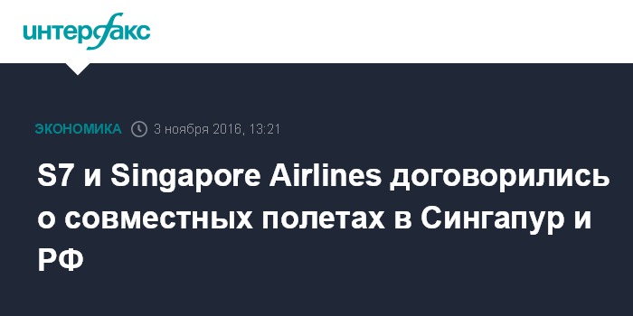 Москва. 3 ноября. INTERFAX.RU - Авиакомпании группы S7 - "Сибирь" и "Глобус" - подписали код-шеринговое соглашение с Singapore Airlines, предусматривающее выполнение совместных рейсов в Сингапур из ряда городов России, говорится в сообщении S7.