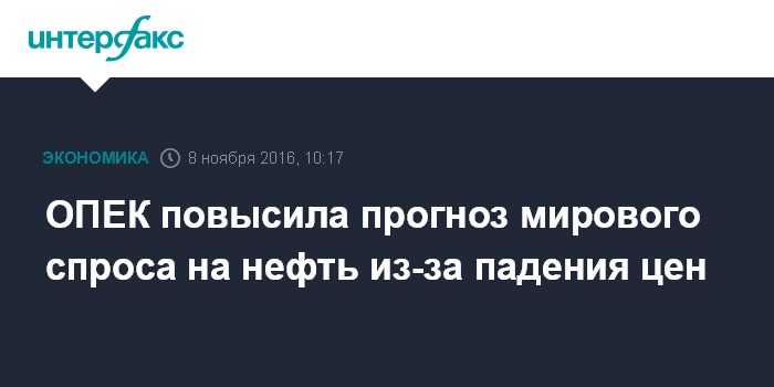 Москва. 8 ноября. INTERFAX.RU - Организация стран-экспортеров нефти (ОПЕК) повысила прогноз мирового спроса на нефть в 2017 году и до конца текущего десятилетия на фоне ожиданий, что снижение цен стимулирует потребление даже в условиях замедления экономического роста.
