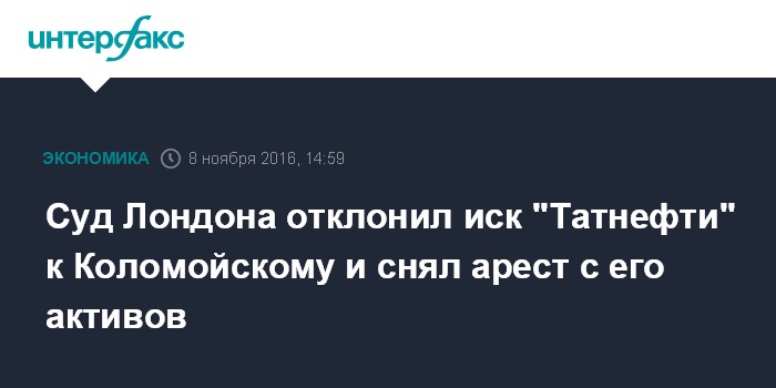 Москва. 8 ноября. INTERFAX.RU - Лондонский суд снял арест с активов украинских бизнесменов Игоря Коломойского и Геннадия Боголюбова на сумму $380 млн в рамках иска "Татнефти" о поставках нефти на Кременчугский НПЗ, сообщило агентство Bloomberg. Арест был наложен в апреле.