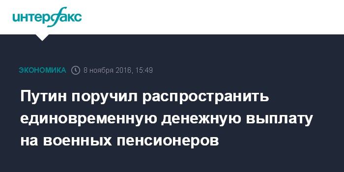 Москва. 8 ноября. INTERFAX.RU - Владимир Путин дал поручение кабинету министров оперативно внести изменения в законопроект о единовременной денежной выплате пенсионерам с тем, чтобы распространить ее на военных пенсионеров и приравненных к ним категориям.