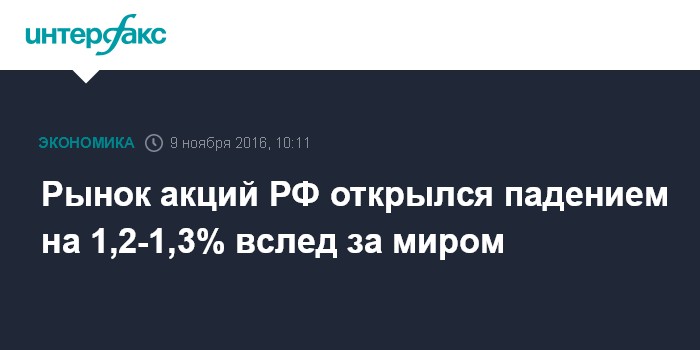 Москва. 9 ноября. INTERFAX.RU - Рынок акций РФ открылся в среду падением цен blue chips вслед за обвалом мировых площадок на новостях из США, где, по предварительным подсчетам, в президентской гонке лидирует представитель республиканцев Дональд Трамп; индексы ММВБ и РТС за минуту торгов потеряли 1,2-1,3%.