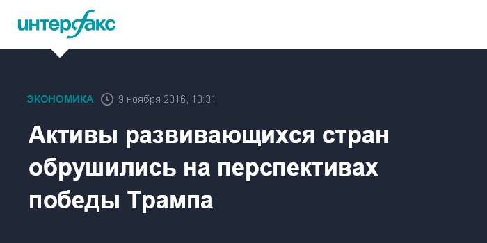 Москва. 9 ноября. INTERFAX.RU - Вероятная победа Дональда Трампа на выборах президента США привела к обвалу стоимости активов развивающихся стран на опасениях, что его политика может привести к снижению объемов глобальной торговли. Кроме того, инвесторы во время волатильности отказываются от рисковых активов и переводят свои средства в более надежные инвестиции - такие, как госбонды, золото и иена.