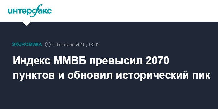 Москва. 10 ноября. INTERFAX.RU - Рублевый индекс ММВБ, один из основных российских фондовых индикаторов, вечером в четверг обновил исторический максимум, превысив 2070 пунктов на фоне общемирового подъема после победы республиканца Дональда Трампа на президентских выборах в США.