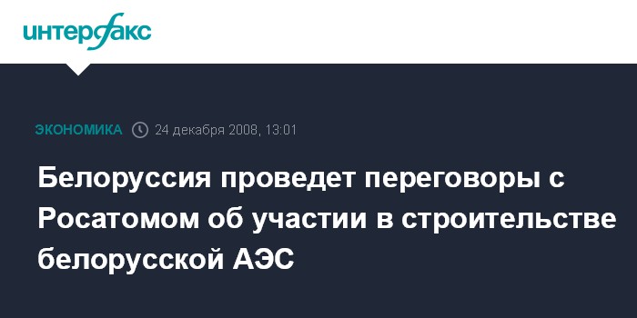 Москва. 24 декабря. INTERFAX.RU - Белоруссия намерена в начале будущего года провести переговоры с российской стороной о ее участии в строительстве первой белорусской атомной станции, сообщил на пресс-конференции в среду в Минске директор департамента по развитию ядерной энергетики министерства энергетики Белоруссии Николай Груша.