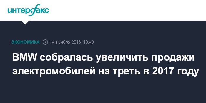 Москва. 14 ноября. INTERFAX.RU - Германская автомобилестроительная компания Bayerische Motoren Werke AG (BMW) намерена в 2017 году увеличить продажи электромобилей на треть - до более чем 100 тыс. машин, заявил глава концерна Харальд Крюгер в интервью Suddeutsche Zeitung.