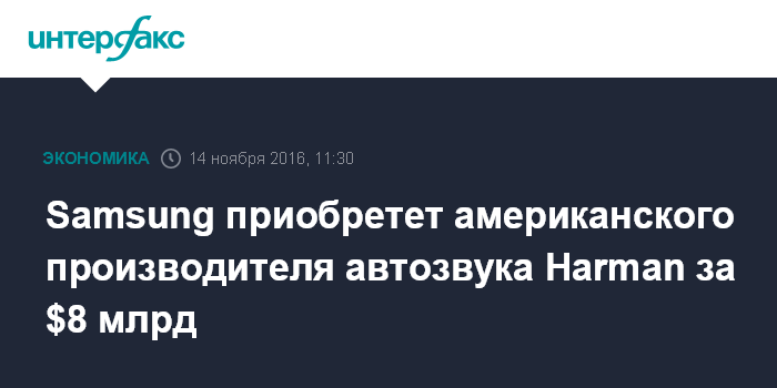 Москва. 14 ноября. INTERFAX.RU - Южнокорейский промышленный гигант Samsung Electronics Co приобретает американского производителя автомобильных аудиосистем Harman International Industries Inc за $8 млрд в денежной форме, чтобы расширить присутствие в этом сегменте рынка.