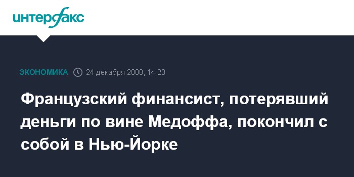 Москва. 24 декабря. INTERFAX.RU - Французский финансист Тьерри Магон де ля Виллюше покончил с собой, обнаружив, что более $1,5 млрд .денег клиентов его фонда растаяли, когда рухнула пирамида нью-йоркского мошенника Бернарда Медоффа.