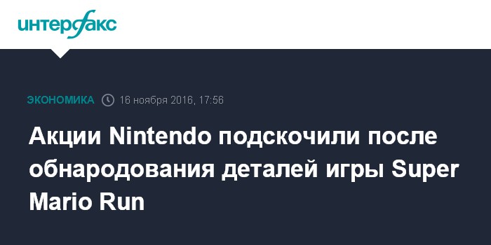 Москва. 16 ноября. INTERFAX.RU - Котировки акций японской компании Nintendo подскочили в среду после того, как она обнародовала детали готовящейся к выпуску игры Super Mario Run для мобильных устройств.