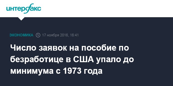Москва. 17 ноября. INTERFAX.RU - Количество американцев, впервые обратившихся за пособием по безработице, на прошлой неделе сократилось на 19 тысяч и составило 235 тысяч - минимум с 1973 года, говорится в отчете министерства труда США. Аналитики, опрошенные MarketWatch, в среднем ожидали повышения показателя до 255 тыс.