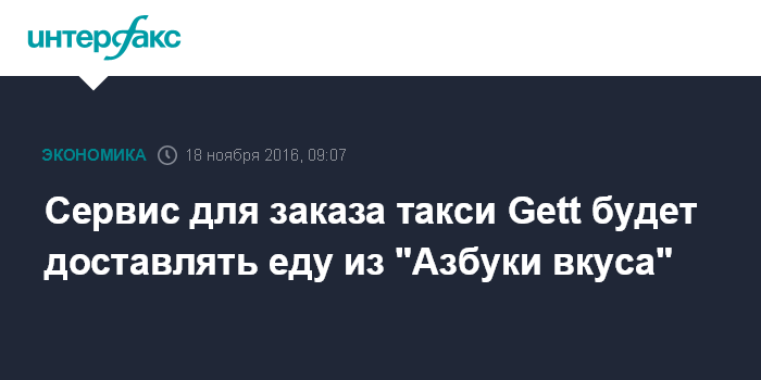 Москва. 18 ноября. INTERFAX.RU - Сервис заказа такси Gett (ранее Gettaxi) договорился с ритейлером "Азбука вкуса" о доставке готовой еды. Об этом пишут "Ведомости" со ссылкой на одного из участников переговоров. В обеих компаниях подтвердили информацию, при этом в "Азбуке" уточнили, что сотрудничество еще не началось - сейчас дорабатываются технические решения.