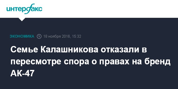 Москва. 18 ноября. INTERFAX.RU - Верховный суд РФ отказал ЗАО "М.Т.Калашников", принадлежащему родственникам конструктора Михаила Калашникова, в пересмотре решения Суда по интеллектуальным правам о досрочном прекращении правовой охраны изобразительного товарного знака автомата, говорится на сайте суда.